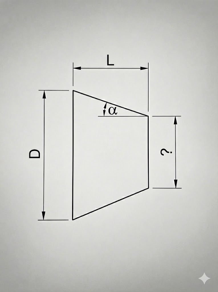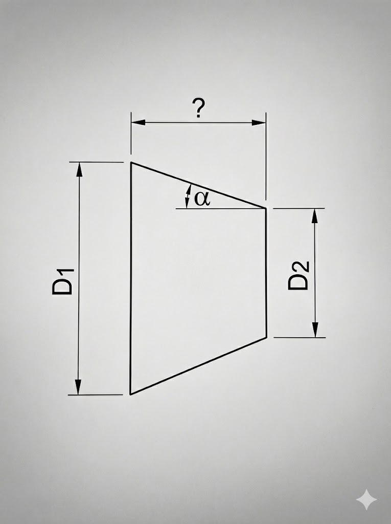 大径と小径の差(直径の差)を求め、その半分である「片肉の寸法」を、角度の正接(タンジェント)で割ることで長さを算出します。